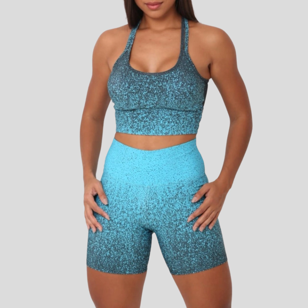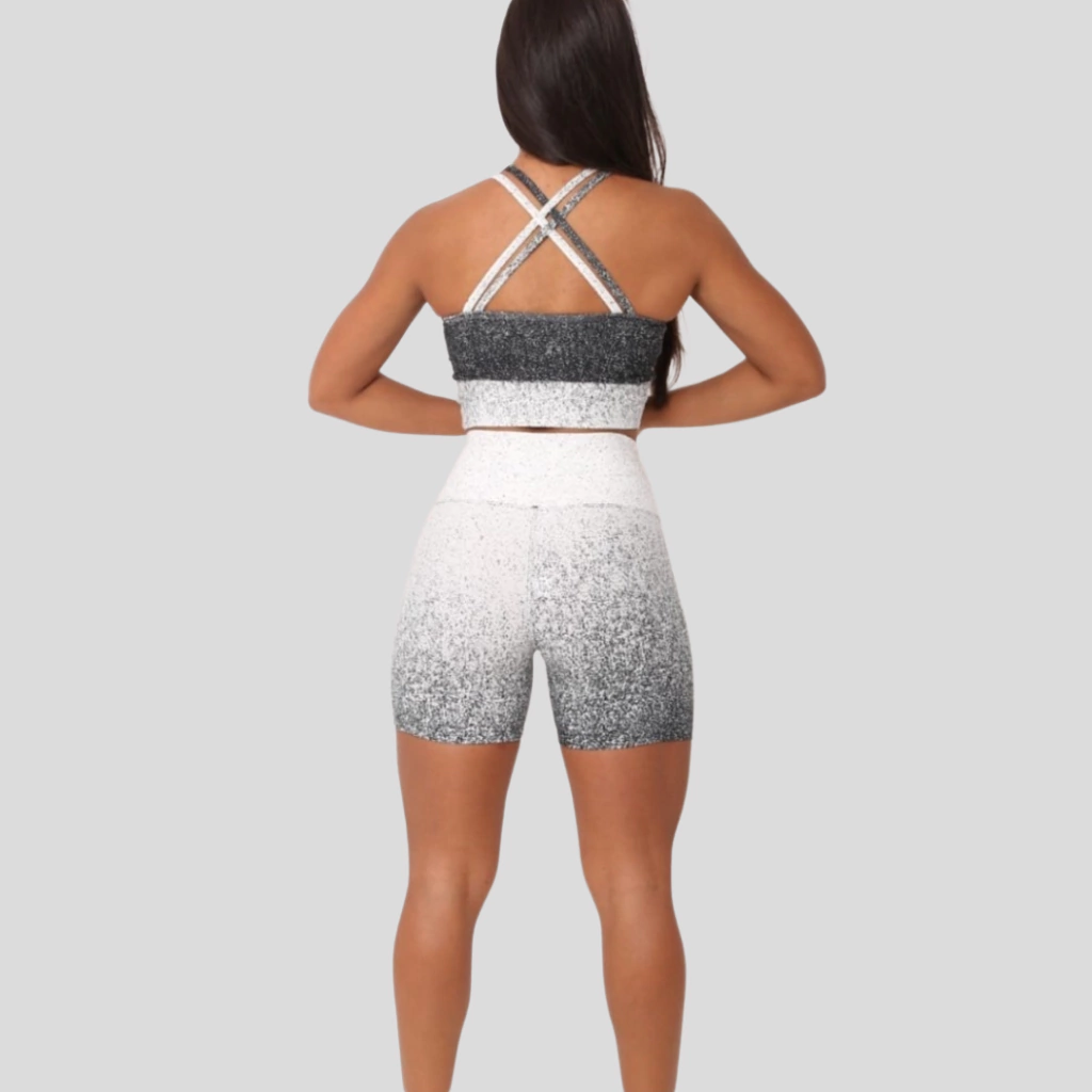 O tecido possui efeito degradê exclusivo, trazendo sofisticação e energia para os treinos. Ideal para quem busca se sentir segura, estilosa e confiante em qualquer atividade física.